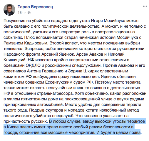 Первым такую мысль оформил в публикации на своей странице в Facebook провластный политолог Тарас Березовец, заявивший, что "ввиду высокой угрозы терактов в Киеве, власть имеет право ввести особый режим безопасности в городе, ограничив все массовые мероприятия. И будет в целом права".