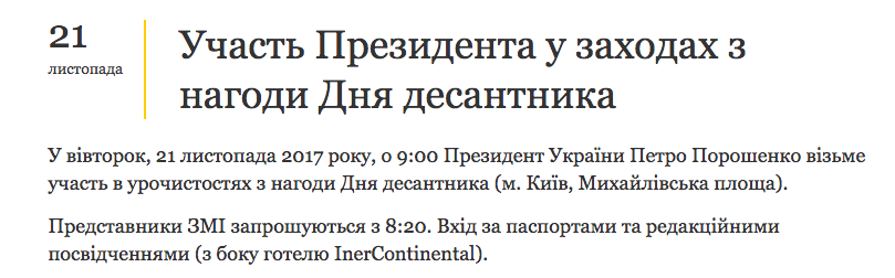 Однако, как оказалось, президент Украины примет участие в совершенно другом мероприятии - посвященном Дню десантника, который в этом году как раз перенесли с августа на ноябрь.