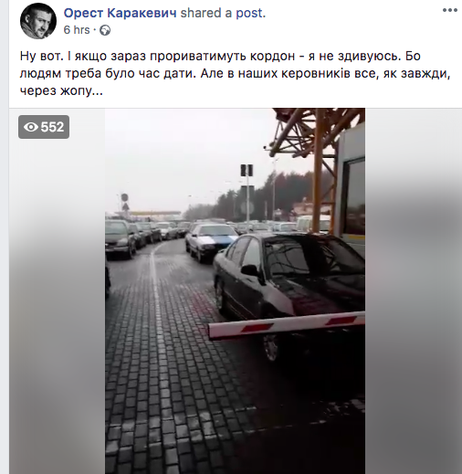 "Ну вот. И если сейчас будут прорывать границу, я не удивлюсь. Потому что людям надо было время дать. Но у наших "керовникив" все, как всегда, через ж..у", - возмущается на своей странице в Facebook львовянин Орест Каракевич.