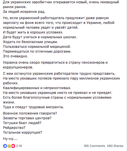 "Для украинских заробитчан открывается новый, очень ликвидный рынок рынок. За людей искренне рад. Но, если украинский работодатель предложит даже равную зарплату на фоне всего того, что происходит в Украине, любой нормальный человек уедет и увезёт детей. И будет жить в хороших условиях. Дети будут учиться в нормальных школах. Ходить по безопасным улицам. Пользоваться нормальной медициной. Перемещаться по отличным дорогами. Это очевидно. Украина очень скоро превратится в страну пенсионеров и коррупционеров.С кем останутся украинские работодатели, трудно представить. На место уехавших поляков приехало пару миллионов украинских рабочих. Квалифицированных и неприхотливых. На место уехавших украинцев никто не приехал и не приедет. Есть более благополучные страны с нормальными условиями жизни. Туда и поедут трудовые мигранты. Военное положение говорите? Захваты торговых центров? Титушки бьют людей? Рейдерство? Тотальная коррупция? Ну-ну...", - написал на своей странице в Facebook Черняк.