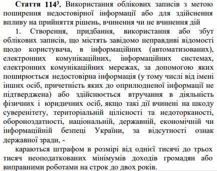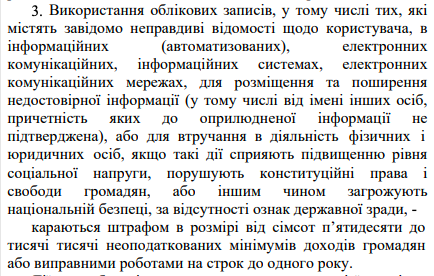 То есть если любой пользователь использует свою учетную запись, чтобы разместить или распространить недостоверную информацию или для вмешательства в деятельность физических и юридических лиц, если такие действия способствуют повышению уровня социального напряжения, нарушают конституционные права и свободы граждан или другим образом угрожают национальной безопасности, при отсутствии признаков госизмены, - этому пользователю грозит штраф от 12750 грн до 17000 гривен или исправительные работы на срок до 1 года.