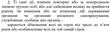 Те же действия, если они, в частности, предпринимались с целью повлиять на какие-либо решения госорганов или органов местного самоуправления, - уже будут наказываться лишением свободы от 3 до 5 лет.
