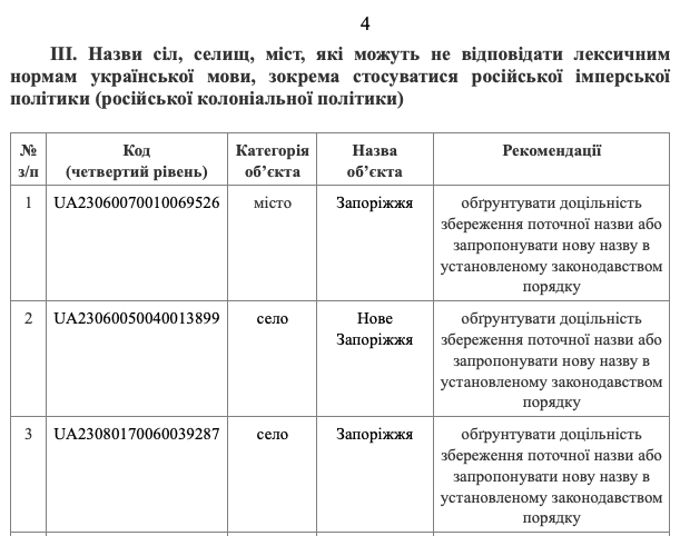 В перечень тех населенных пунктов, которые "могут не соответствовать лексическим нормам украинского языка, в частности касаться российской имперской политики", вошел областной центр Запорожской области, город Запорожье. Комиссия рекомендовала обосновать целесообразность сохранения текущего названия или предложить новое название. На это у местных властей есть шесть месяцев. Если они не сделают этого в указанный срок, название будет менять Верховная Рада по решению комиссии.