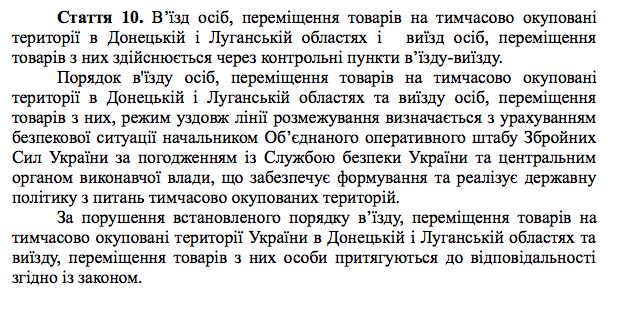 В 10 статье законопроекта говорится о том, что Начальник Объединенного оперативного штаба ВСУ также должен устанавливать порядок въезда и выезда на оккупированные территории, а также перемещения товаров. Делать он это должен по согласованию с СБУ и Министерством по делам оккупированных территорий.