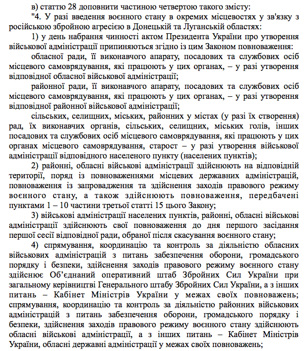 Закон "О правовом режиме военного положения" дополнен нормаой, по которой, в случае введения военного положения в отдельных местностях прекращаются полномочия областного, районного, сельских, поселковых, городских, районных в городах советов, сельских, поселковых, городских председателей, других должностных и служебных лиц местного самоуправления и старост.
