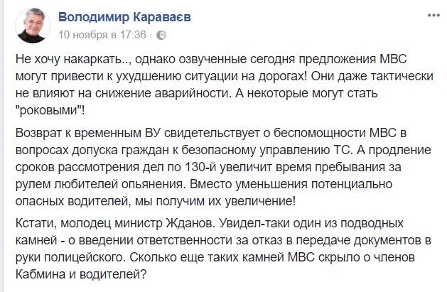 Уже через неделю стали известны первые детали планируемых новшеств. Заместитель председателя Координационного совета Общенационального форума дорожного движения Владимир Караваев на своей странице в Facebook проинформировал, что именно приготовили для водителей в недрах МВД.