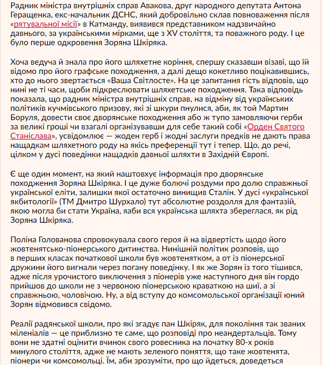 Оставшаяся часть материала посвящена "графскому происхождению" гостя программы, соратника "народофронтовцев" Авакова и Геращенко, Зоряна Шкиряка: так, в тексте сказано, что ведущая "кокетливо поинтересовалась, кто к нему обращается "Ваша Светлость", на что "гость ответил, что сейчас не те времена, чтобы подчеркивать благородное происхождение".