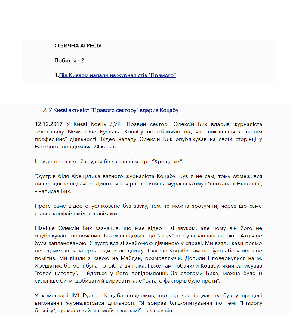Многие случаи насилия против журналистов структура Оксаны Романюк просто игнорирует. Так, в ИМИ не посчитали нужным внести в перечень преступлений против прессы случай в селе Ходосовка, где неизвестные избили журналиста проекта "Стоп коррупции", когда он проводил свое журналистское расследование. Врачи диагностировали у 24-летнего журналиста ушиб мягких частей головы, травму шеи, закрытую травму грудной клетки.