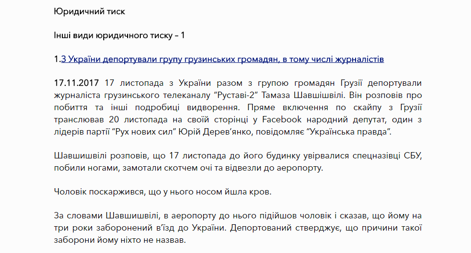 К примеру, в ноябре оператора грузинской телекомпании "Рустави 2" Тамаза Шавшишвили с явными нарушениями депортировали из Украины. Сам Тамаз в интервью "Стране" подробно рассказывал, как проходила его депортация: 15 человек в черных масках с автоматами, скотч на глазах, наручники, избиение ногами. По словам Шавшишвили, руководил операцией по его изгнанию из страны начальник Управления госохраны Валерий Гелетей.