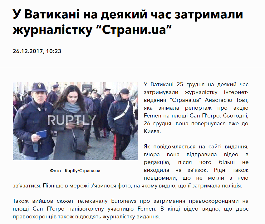 Так, не обратили внимания в ИМИ и на резонансное задержание римской полицией журналистки "Страны" Анастасии Товт в Ватикане во время съемки акции "Фемен". На сайте ИМИ можно найти лишь новость, посвященную задержанию (со странной формулировкой в заголовке "задержали на некоторое время", тогда как редакция целый день не могла выйти с ней на связь), но в "Барометр" этот случай не включили. Нет на сайте ИМИ и упоминаний о том, что дело журналистки взял под свой контроль Совет Европы, присвоив ему вторую степень угрозы для свободы медиа.