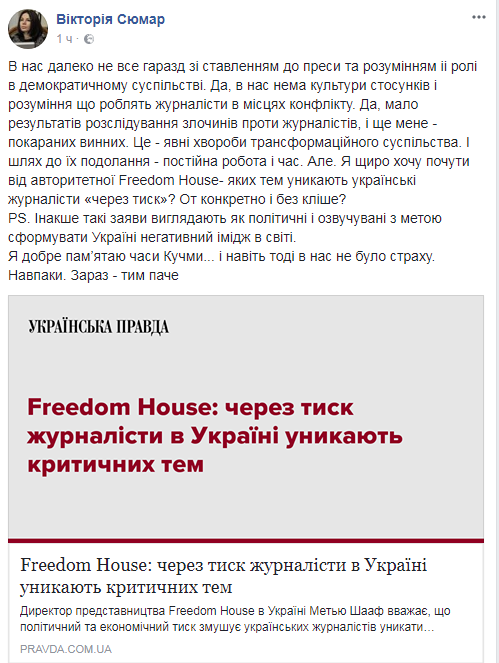 В словах Шаафа усомнилась экс-глава ИМИ Виктория Сюмар. "Я искренне хочу услышать от авторитетной Freedom House – которых тем избегают украинские журналисты "из-за давления"? Вот конкретно и без клише? P.S. Иначе такие заявления выглядят как политические и озвучиваемые с целью сформировать Украине негативный имидж в мире", – написала она на своей странице в Facebook.