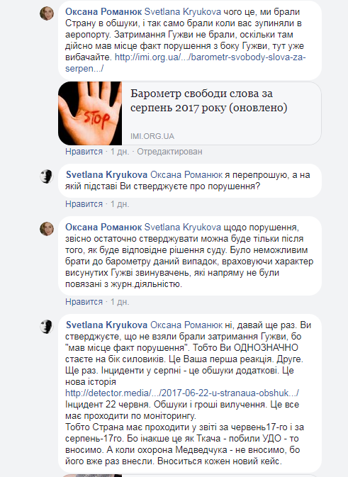 Эту избирательность буквально на днях в комментариях в социальных сетях попыталась объяснить Оксана Романюк: "Задержание Гужвы не брали, так как там действительно имел место факт нарушения со стороны Гужвы", – дословно написала Романюк. Но на уточняющий вопрос "Страны", на каком основании она делает вывод о том, что был факт нарушения, Романюк начала оправдываться: "О нарушении, конечно, окончательно утверждать можно будет только после того, как будет соответствующее решение суда. Было невозможным принимать в "Барометр" данный случай, учитывая характер выдвинутых Гужве обвинений, которые напрямую не были связаны с журналистской деятельностью".