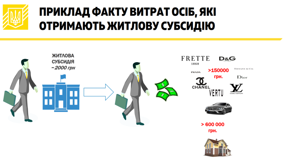 В презентации Минфина приводится следующий пример: человек претендует на субсидию в 2 тыс. грн, но при этом сделал покупок более чем на 150 тыс. грн или имеет дом, дороже 600 тыс. грн. Понятно, что в данном случае ему откажут.