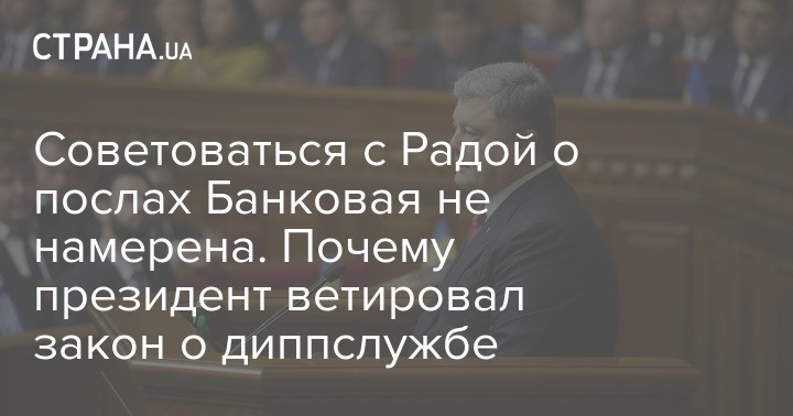 Президент Петр Порошенко ветировал новый закон "О дипломатической службе", проект которого сам же внес в Верховную Раду. Таким образом, документ возвращен в парламент.