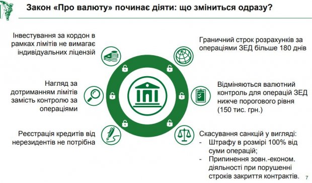 Также закон отменяет валютный контроль для сделок по покупке и переводу валюты на сумму до 150 тысяч грн в эквиваленте.