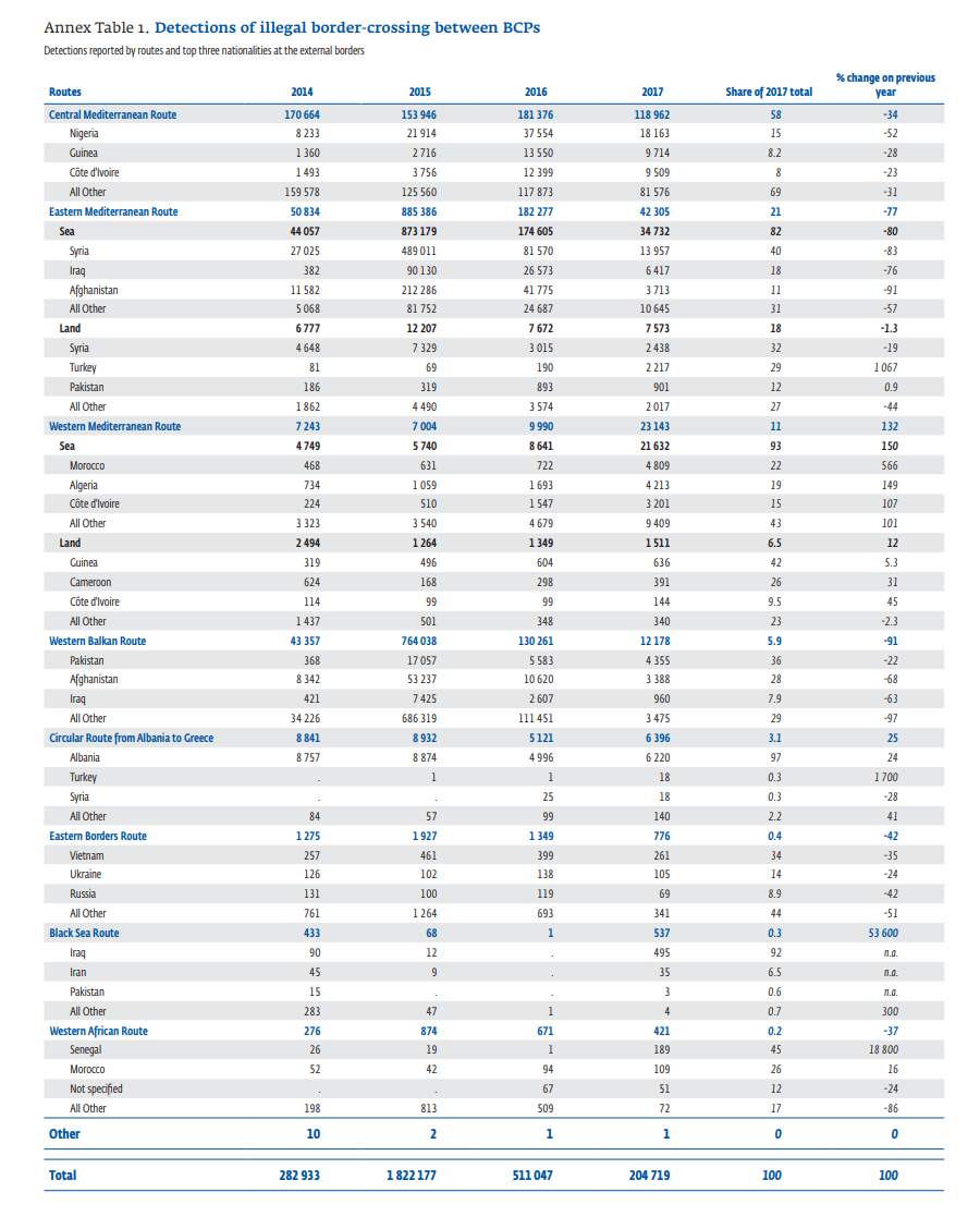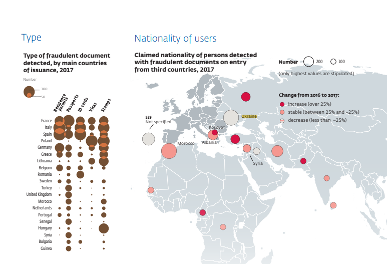 В 2017 году большинство случаев мошенничества с документами на сухопутных границах были зарегистрированы между Украиной и Польшей (519), в основном с участием украинских граждан, имеющих поддельные польские визы. Однако режим либерализации виз для украинских граждан, вступивший в силу в июне 2017 года, способствовал уменьшению числа украинцев, злоупотребляющих получением визы мошенническим путем, сказано в отчете.