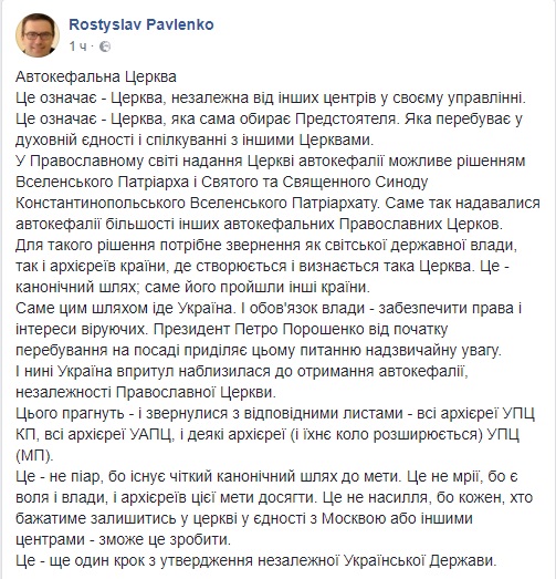 "В окружении президента была группа людей во главе с Ростиславом Павленко, которые решили подарить Порошенко "вундерваффе" (чудо-оружие - ред.) для победы на выборах. Они его убедили, что можно быстро договориться со Вселенским патриархатом об автокефалии и продать это избирателю как колоссальную победу. Именно на основе их информации Порошенко и озвучивал ориентиры по Томосу к Дню Крещения Руси. Но реальность вышла совсем другой. Получается, Павленко и Ко просто подставили президента и теперь рассказывают про то, что "блицкрига" никто и не ждал"".