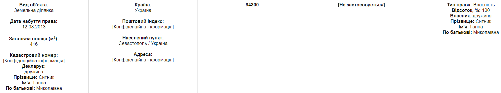 Его материал касался элитного участка площадью 0,0416 га на территории садоводческого кооператива "Мираж" в Нахимовском районе Севастополе. Еще до аннексии Крыма, в 2013 году, его приобрела за 94,3 тысяч гривен супруга Артема Сергеевича - Анна Сытник.
