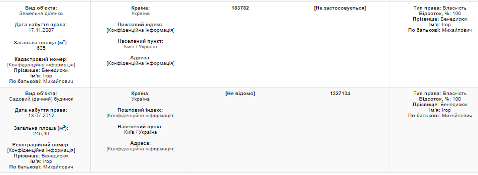 В собственности главы ВСП находятся также гараж в Киеве и участок площадью 23 сотки в Бориспольском районе. Еще Игорь Бенедисюк задекларировал квартиру в Киеве площадью 97 кв. м. Ему принадлежит половина квартиры, еще по 25 % записаны на сыновей Игоря и Андрея: