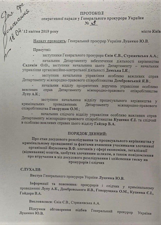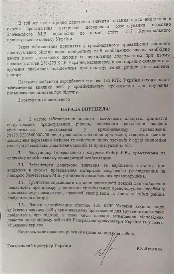 И, как следует из наложенной резолюции "к выполнению", как раз это было поручено сделать путем размещения соответствующих уведомлений о вызове данных фигурантов на допросы с целью вручения "пидозр" на сайте Генпрокуратуры и в "Урядовом курьере".