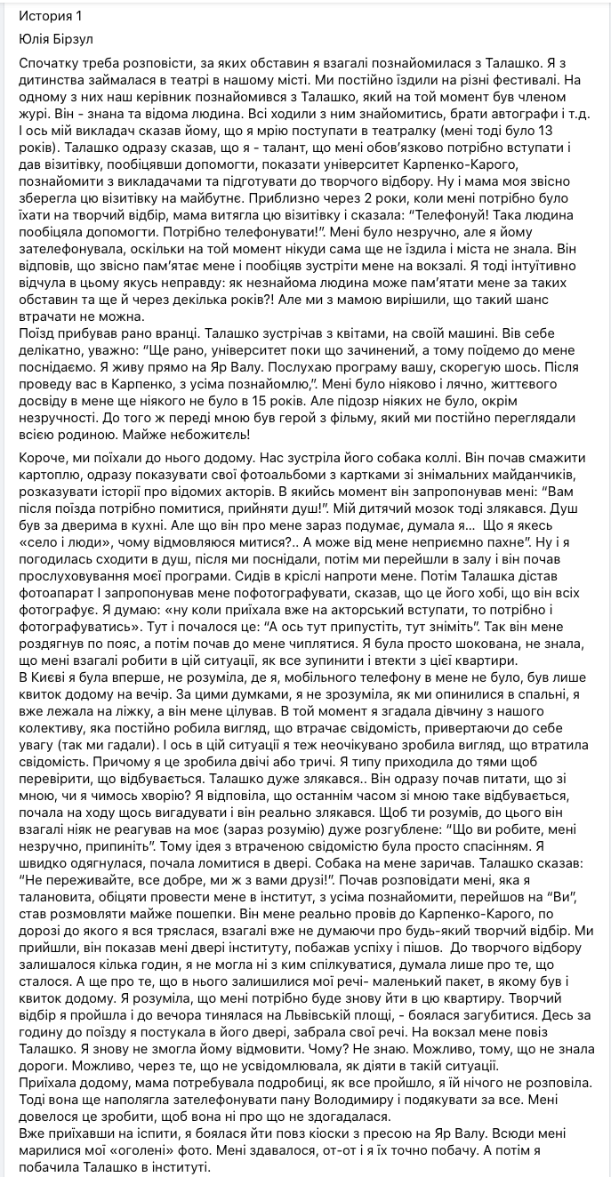 "В этом году Талашко собирался набрать новый курс, а ему уже 75 лет и его отклонения могут прогрессировать. Этому в основном подвержены абитуриентки – максимально незащищённые девочки, часто приезжие из других городов, у которых здесь нет семьи, друзей и поддержки. Я сначала хотела рассказать о домогательствах Талашко анонимно, но узнав историю Юлии Бирзул, с которой это произошло в 15 лет, я решила, что готова говорить об этом открыто. Потому что про какие-то анонимные истории очень легко сказать, что это выдумка. Хотя мне крайне не хотелось это подкреплять своим именем, потому что это неприятный пиар для меня и для моей семьи. Но факт того, что это продолжается до сих пор… Если я так легко отделалась, это не значит, что у других девушек получится", – отметила в комментарии "Стране" Виктория Муштей.