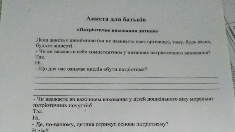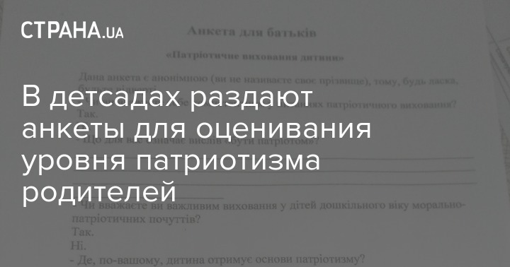 Впрочем, на местах рекомендации Минобразования об усилении патриотической составляющей восприняли буквально. Например, в дошкольных учреждениях Сум детям раздали анкеты, в которых родителей просят оценить свой уровень компетентности в вопросах патриотического воспитания, пояснить, что означает выражение "быть патриотом" и отметить, где ребенок получает "основы патриотизма" - в детских садах или в кругу семьи.