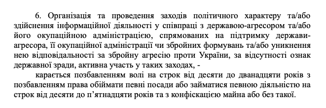 По сути, именно этот пункт - один из ключевых в этом законе. После вступления закона в силу любое "сотрудничество" украинских СМИ или политиков с РФ, будь то телемосты, прямые трансляции или публикации выступлений чиновников из России, совместные конференции, или даже получение комментариев официальных должностных лиц государства-агрессора могут быть приравнены к "осуществлению информационной деятельности в поддержку государства-агрессора". И за это светит реальный и очень длительный тюремный срок - минимум 10 лет, с возможной конфискацией имущества.