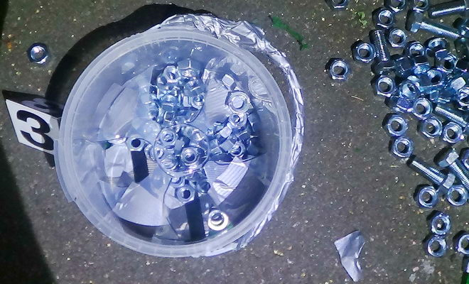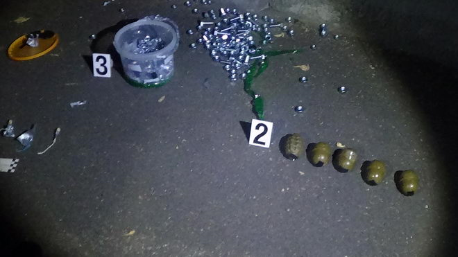 Под контролем представительского начальства специалисты установили, что "находка" офцера УГО представляла собой прозрачное ведро с крышкой емкостью 4 литра, обмотанное скотчем. Оно было присоединено к пруту ограды пластиковыми хомутами длиной 50 см черного цвета. На хомутах была видна маркировка S-28 и S-26. Взрывотехники установили содержимое ведра: 14 болтов и 120 хромированных гаек, 5 электродетонаторов, 4 гранаты РГД-5 и одна Ф-1, на которых были затерты серийные номера.