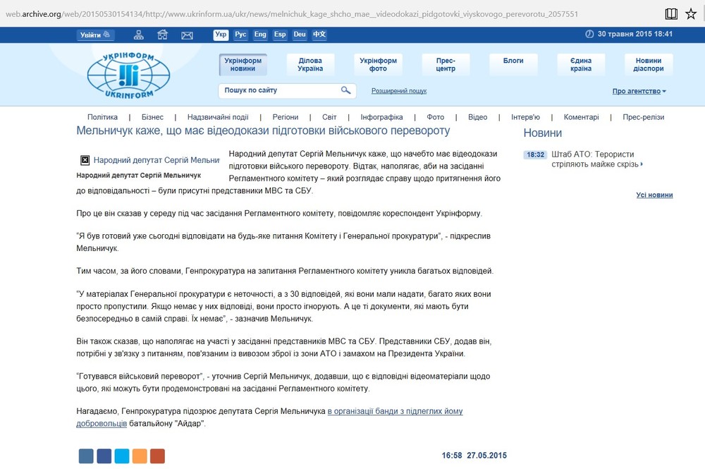 Наконец, 27 мая 2015 года народный депутат Сергей Мельничук, которому на тот момент грозило снятие депутатской неприкосновенности, на заседании парламентского комитета заявил, что якобы имеет видеодоказательства подготовки военного переворота в Украине. А также сведения о готовящемся покушении на президента Украины.