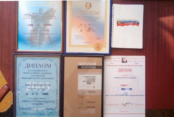 – Спросили, есть ли. Говорю, нет. "Ну, значит, без адвоката". Понятыми, по-моему профессиональными, были две молоденькие девушки. Следователей поразило, что у меня нет телевизора, а на его месте небольшой иконостас. Всё пытались меня на его фоне сфотографировать. Мол, вот они – православные. Кстати, там на фото СБУ выглядит так, как будто дипломы литературных премий, кинофестиваля "Радонеж" у меня на стене висят. Нет, это они из нижнего ящика стола достали и разложили. Причём выборочно. Украинские грамоты, в том числе от "Зеркала недели", их почему-то не интересовали.