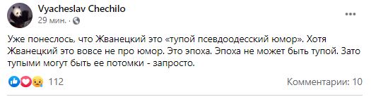 "Уже понеслось, что Жванецкий это "тупой псевдоодесский юмор". Хотя Жванецкий это вовсе не про юмор. Это эпоха. Эпоха не может быть тупой. Зато тупыми могут быть ее потомки - запросто".