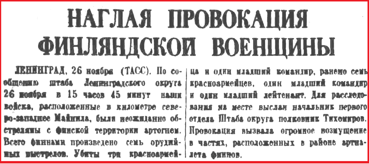 Началу же ее предшествовал так называемый "майнильский инцидент" 26 ноября – артиллерийский обстрел у приграничной советской деревни Майнила, в результате которого, по заявлениям советской стороны, погибло четверо военнослужащих. Сам факт стрельбы подтвердили обе стороны. Только Москва заявляла, что стреляли с финской территории, а Хельсинки – что с советской, расценивая это как провокацию, чтоб получить повод для начала войны.