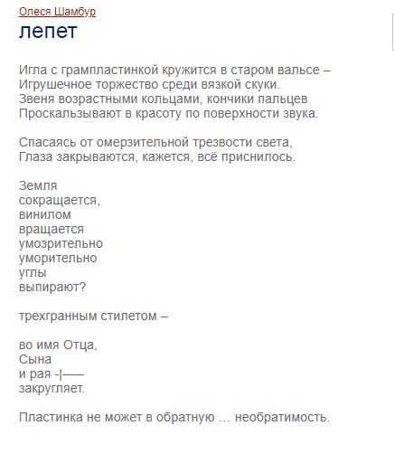 Здесь всего несколько стихов автора по имени Олеся Шамбур, вот один из них.