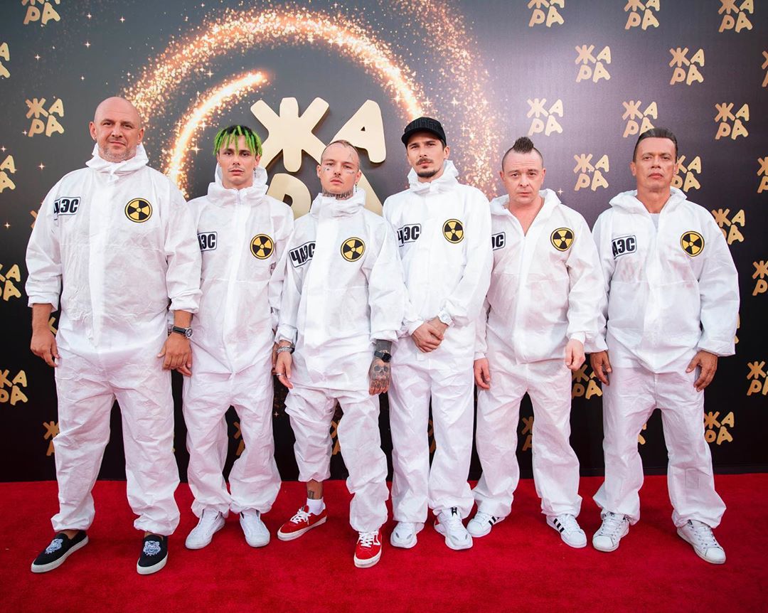В один день с Настей выступал ее супруг вместе со своим проектом MOZGI. Они появились на ковровой дорожке к белых костюмах, напоминающих спецодежду ЧАЭС.