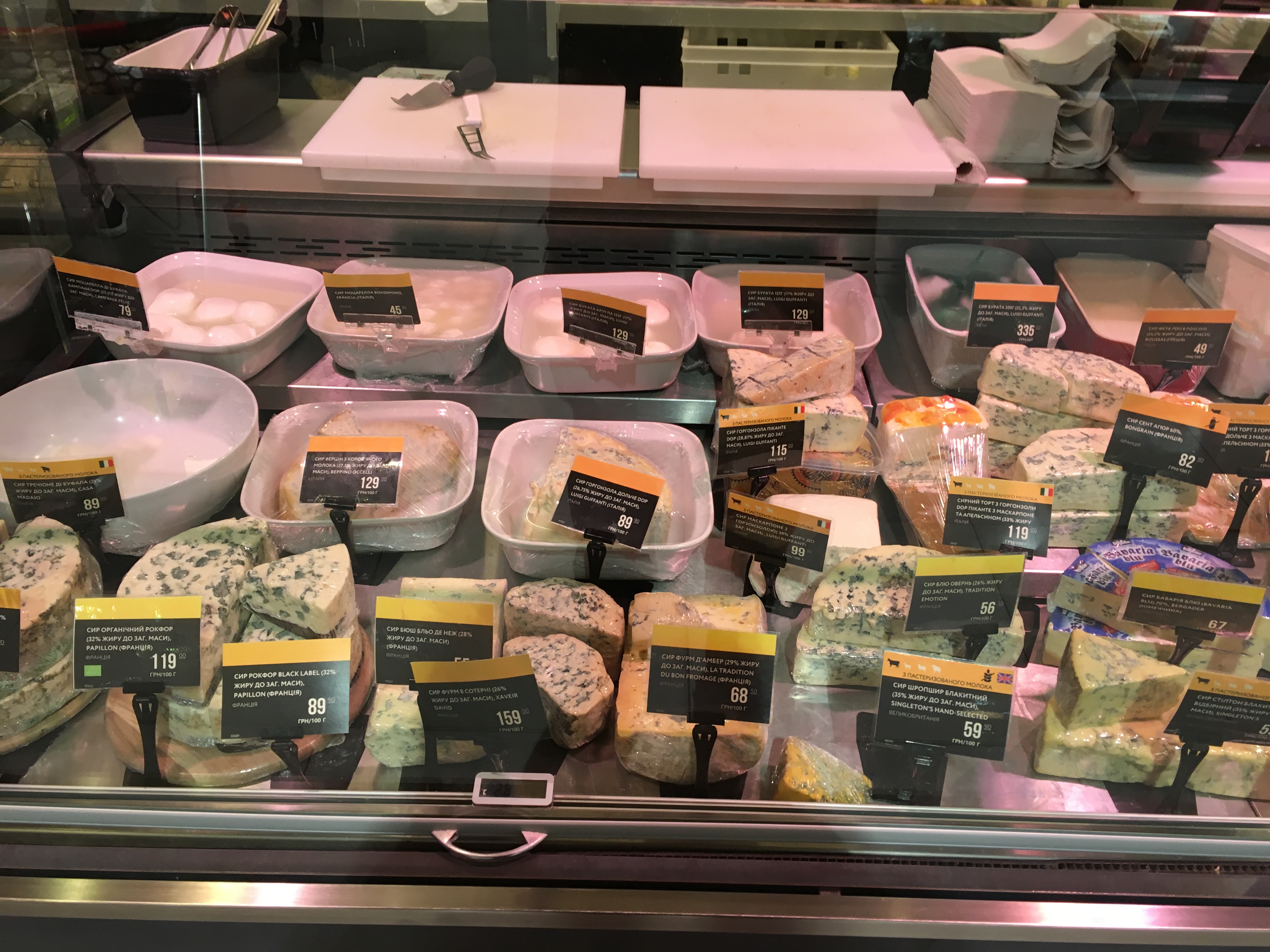 Здесь нельзя купить килограмм сыра за 58 гривен. От 56 до 335 грн – это ценник за 100 грамм. К примеру 100 грамм выдержанного овечьего сыра El Pastor Castellano (Испания) стоит 59 гривен, а итальянская буратта Luigi Buffanti (итальянский свежий сыр, изготавливаемый из сливок и молока буйволицы) продается по цене 129 гривен/100 гр.