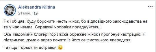 "Как и обещал, буду защищать честь женщин, ибо соответствующего законодательства у нас нет. Настоящие мужчины, присоединяйтесь!", - пишет Клитина.
