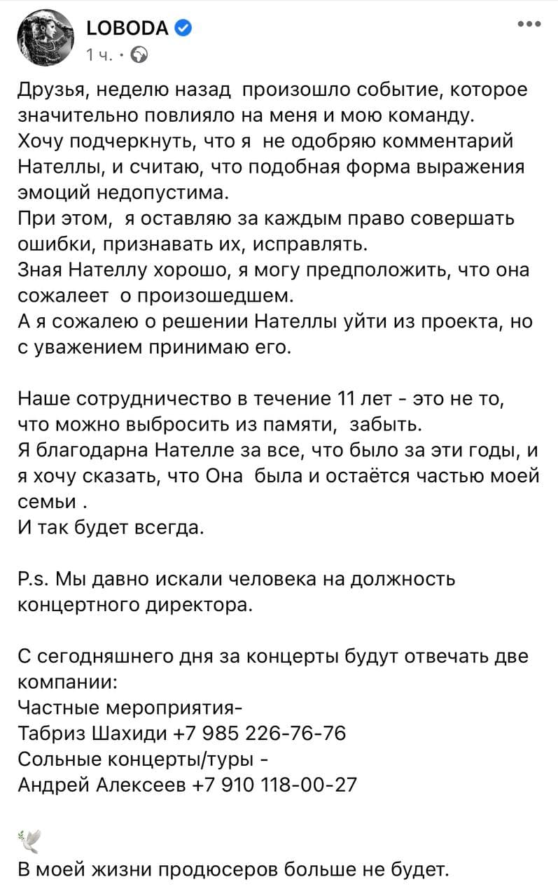 Зная Нателлу хорошо, я могу предположить, что она сожалеет о произошедшем. А я сожалею о решении Нателлы уйти из проекта, но с уважением принимаю его. Наше сотрудничество в течение 11 лет - это не то, что можно выбросить из памяти, забыть. Я благодарна Нателле за все, что было за эти годы, и я хочу сказать, что Она была и остаётся частью моей семьи. И так будет всегда. P.s. Мы давно искали человека на должность концертного директора. С сегодняшнего дня за концерты будут отвечать две компании: частные мероприятия - Табриз Шахиди, сольные концерты/туры - Андрей Алексеев. В моей жизни продюсеров больше не будет", - сообщила Светлана.