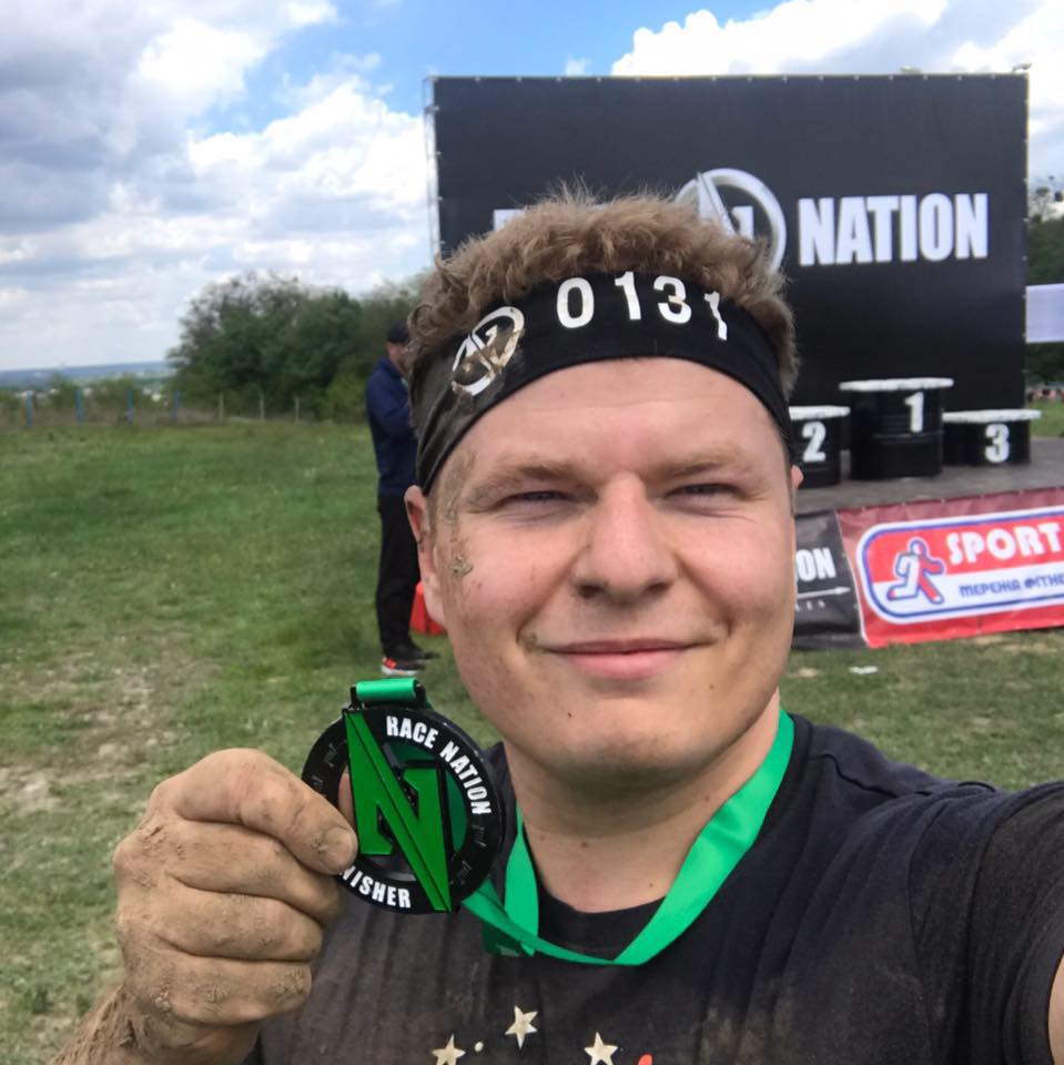 Игорь показывает медаль, которую выдают участникам "Гонки наций" после финиша, фото: facebook.com