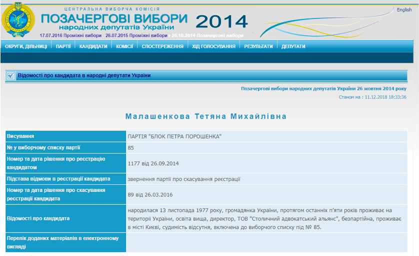 По сведениям "Страны" во время работы в адвокатской фирме Татьяна Малашенко взаимодействовала с доверенным лицом Петра Порошенко и нынешним народным депутатом Юрием Буглаком, а также с Алексеем Порошенко.