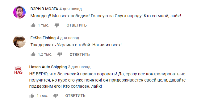 Под любым видео на канале "Зе!Президент" можно найти идентичные по смыслу ботские комментарии с комплиментами в адрес президента, которые прямо призывают поставить лайк. Именно эти комментарии, кстати, набирают свыше тысячи лайков, тогда как остальные комментарии, в которых живые пользователи критикуют президента или задают острые вопросы, собирают всего несколько лайков.