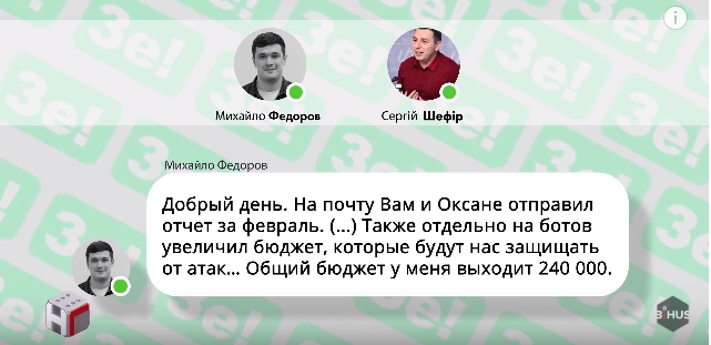 Из переписки следует, что Михаил Федоров, который отвечает в команде Зе за айти-вопросы, занимается, в том числе, и "ботоводством" - то есть содержит ботов, которые приходят в комментарии в соцсетях и на YouTube и поддерживают Зеленского, или же "мочат" тех журналистов, которые критикуют Зе.