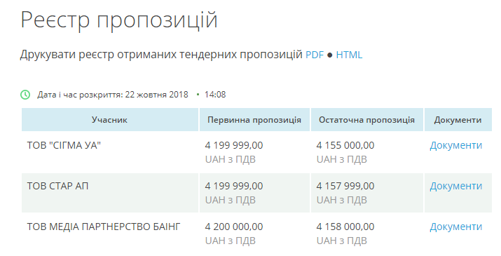 В тендере на 4,2 млн все три фирмы выставили начальные цены, которые отличались на 1 грн. Окончательные ценовые предложения фирм, которые "проиграли" тендер, также отличались всего на 1 грн. Цена победителя "Сигма УА" отличалась от цен конкурентов всего на 3 тыс. грн, снизившись во время "торгов" на 45 тыс. грн: