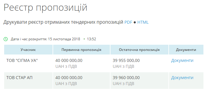 Оставшиеся две фирмы выставили совершенно одинаковые начальные цены – ровно по 40 миллионов. В ходе "торгов" цена снова упала на те же 45 тысяч, что и на предыдущем тендере. Это составило всего 0,11 % от первоначальной цены: