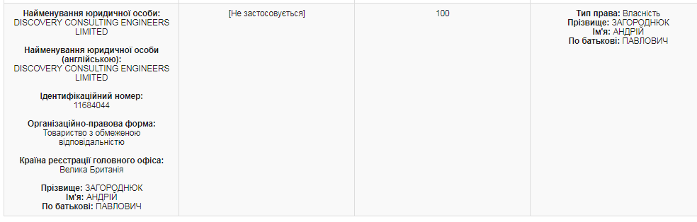 Кроме того, согласно поданной декларации, Андрей Загороднюк является 100-процентным владельцем британской компании Discovery Consulting Engineers Limited: