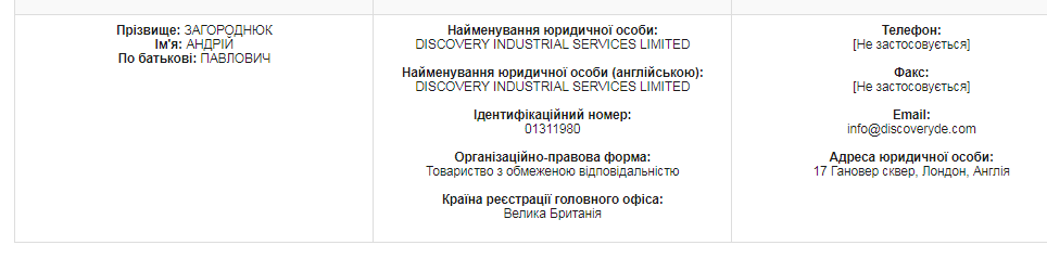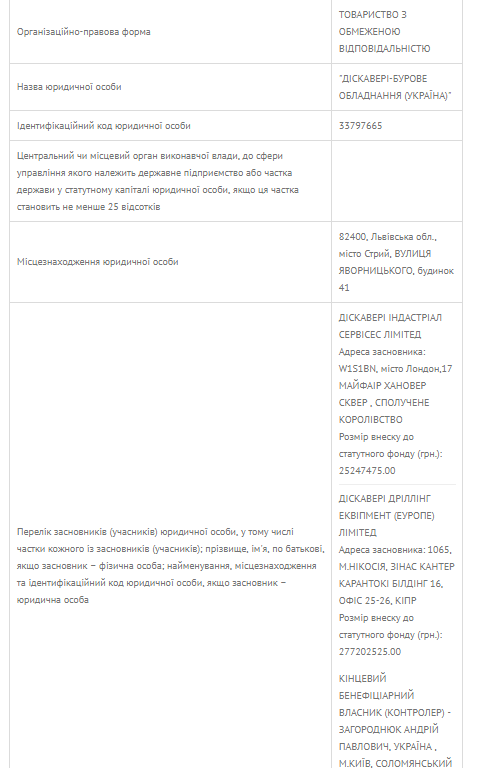 На обе эти фирмы (и британскую, и кипрскую) записаны права собственности на украинскую фирму "Дискавери - буровое оборудование (Украина)". Единственным бенефициаром (конечным владельцем) которой в украинском реестре юридических лиц указан Андрей Загороднюк: