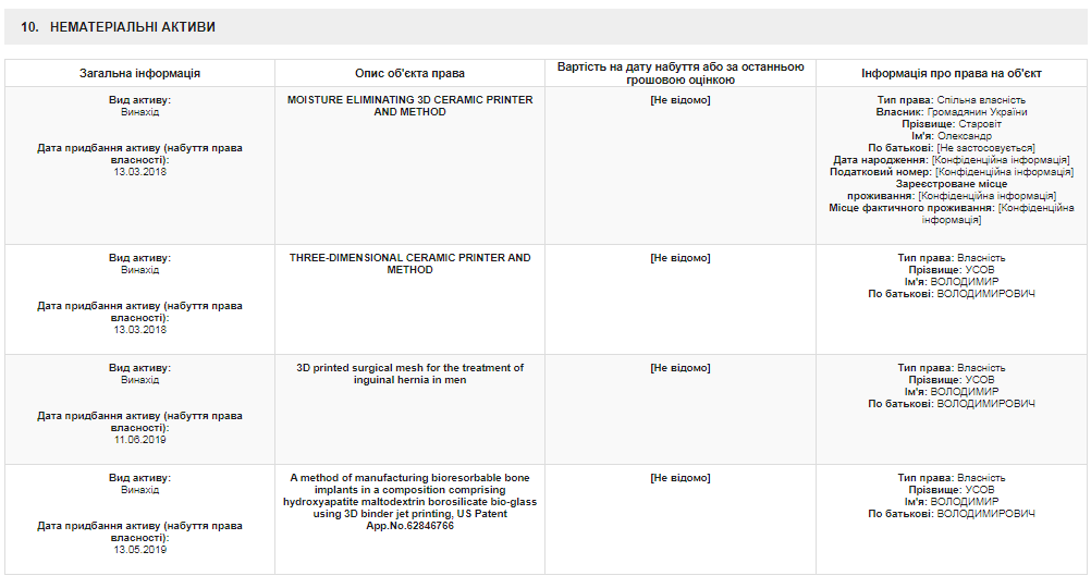Есть еще один показательный нюанс. В своей декларации за 2019 год Владимир Усов задекларировал наличие у него четырех изобретений, связанных с 3Д-печатью: