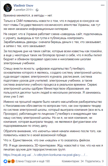 После того как стало известно о победе Владимира Усова на конкурсе на должность главы Госкосмоса, вспыхнул скандал. Усов сразу же ответил, что все обвинения - это фейк, и что "мочить" его начали целенаправленно.