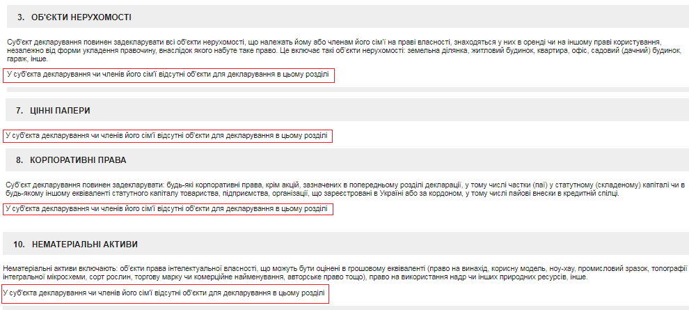 Например, в декларации за 2018 год Владимир Усов сообщил, что вообще не имеет недвижимости, ценных бумаг, корпоративных прав и нематериальных активов. Во всех соответствующих разделах декларации Усов указал, что у него и членов семьи "отсутствуют объекты для декларирования в этом разделе":
