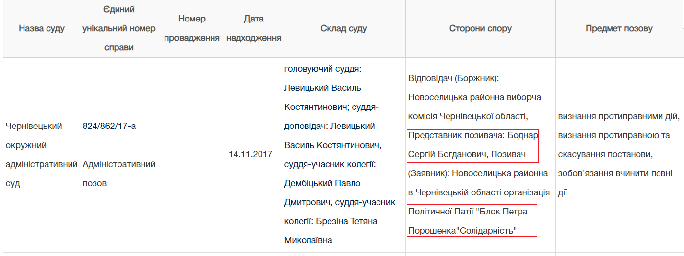 Дело в том, что в конце 2017 года нынешний судья ВАКС Сергей Боднар "засветился" в качестве представителя Блока Петра Порошенко в суде по иску президентской партии против Новоселицкой районной избирательной комиссии Черновицкой области: