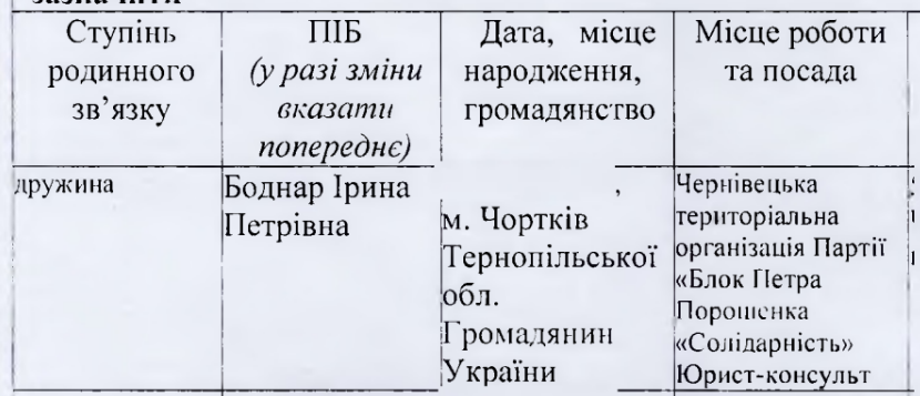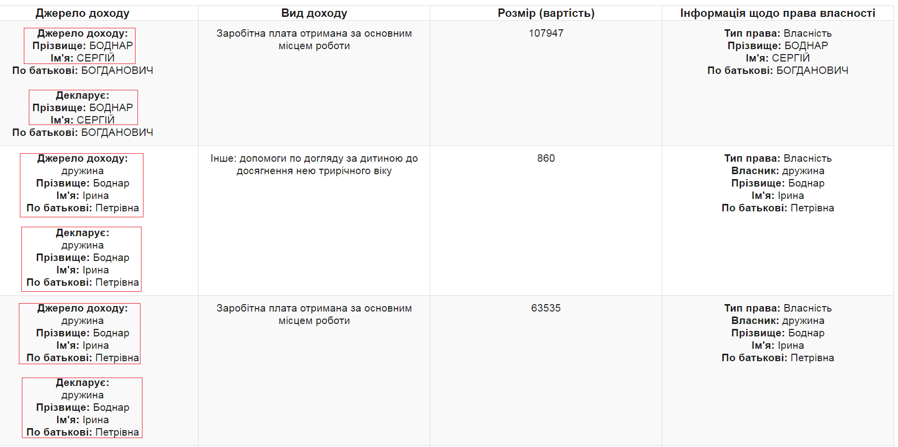 В декларации за 2019 год судья Боднар подтвердил данную информацию, сообщив, что его жена за год получила больше 65 тысяч грн зарплаты по основному месту работы в Черновицкой территориальной организации партии Петра Порошенко "Европейская солидарность":
